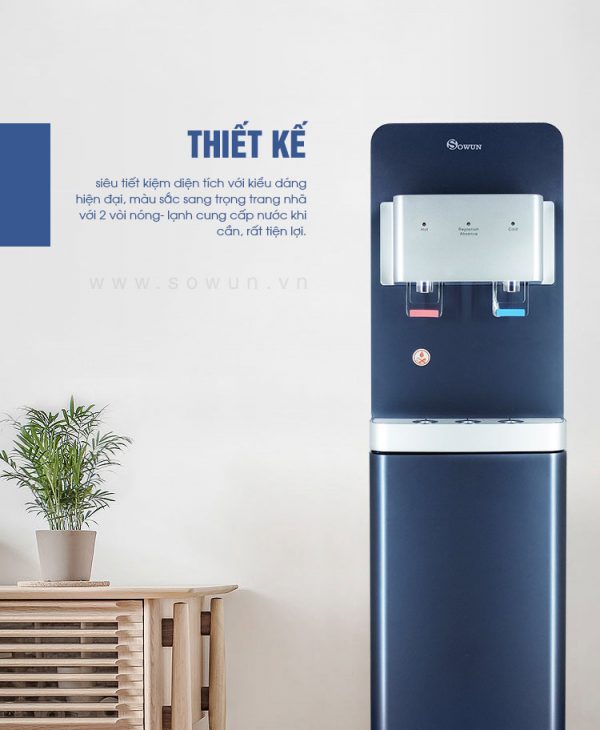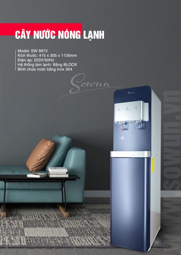- Cây nước nóng lạnh SW 9972 được thiết kế siêu tiết kiệm diện tích với kiểu dáng hiện đại, màu sắc sang trọng trang nhã với 2 vòi nóng- lạnh cung cấp nước khi cần, rất tiện lợi.