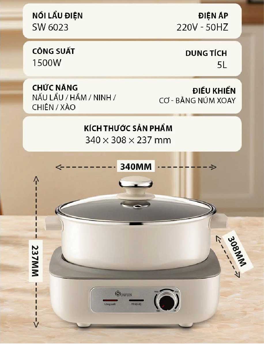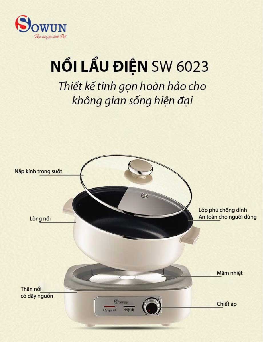 Lẩu điện đa năng SOWUN SW 6023 là lựa chọn hoàn hảo cho những bữa ăn gia đình Việt. Với dung tích lớn 5L, thiết kế lòng nồi tháo rời, sản phẩm đáp ứng nhu cầu nấu nướng đa dạng, linh hoạt chế biến các món ngon cho gia đình.