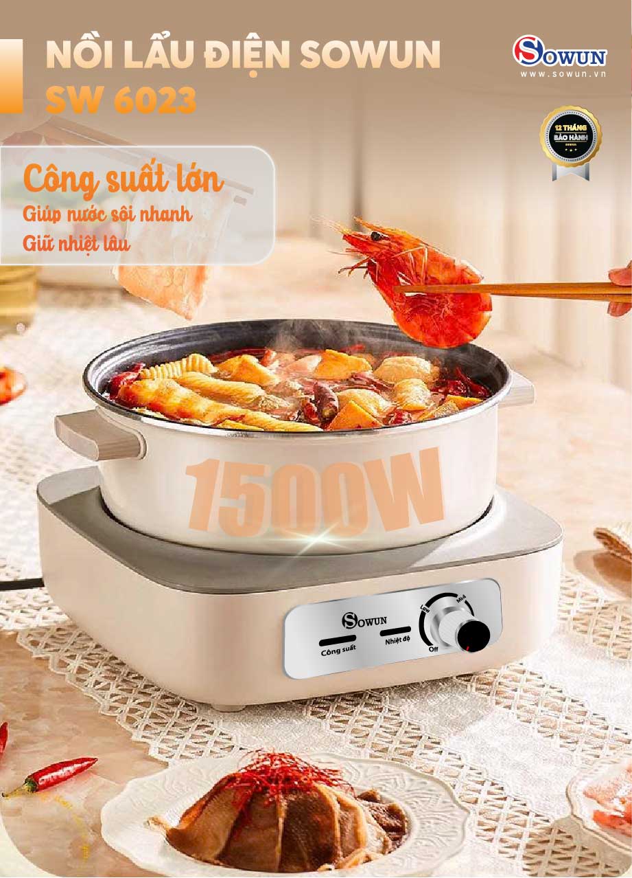 Lẩu điện đa năng SOWUN SW 6023 được thiết kế với công suất 1500W mạnh mẽ hỗ trợ chế biến nhanh chóng các món ăn, đáp ứng nhu cầu của cả gia đình hay những buổi họp mặt đông người. Bạn cũng có thể tận dụng dung tích lớn của nồi để linh hoạt chế biến các món ăn khác nhau như chiên, xào, rán,… trong những buổi họp mặt đông người. Một sản phẩm nhưng có thể đáp ứng công năng của nhiều thiết bị bếp khác nhau.