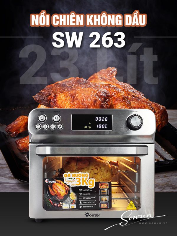 Nồi chiên không dầu lò nướng Sowun SW 263 có dung tích lớn 23 lít, phần khoang chiên, nướng rộng rãi, hoàn toàn có thể quay gà, vịt, ngan nguyên con, hay chế biến nhiều loại thực phẩm cùng một lúc