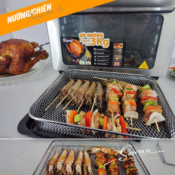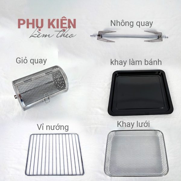 *Linh phụ kiện đa dạng gồm: xiên quay, giỏ/lồng quay, dụng cụ gắp đồ, vỉ nướng, khay hứng dầu/ đồ ăn, tấm lưới chắn dầu