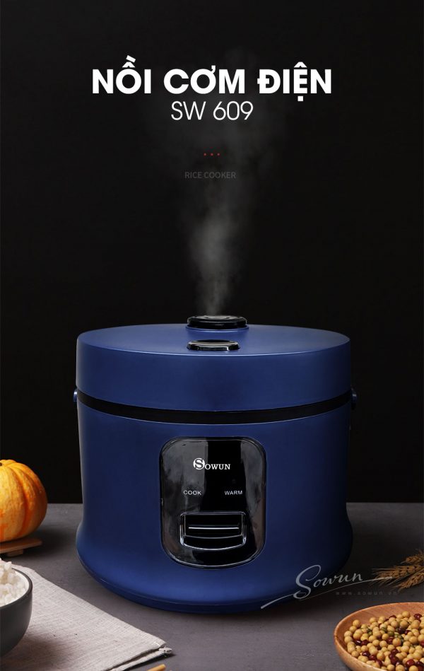Nồi cơm điện SOWUN SW609 có thiết kế đơn giản, mềm mại với gam màu xanh than bắt mắt cảm giác tao nhã sạch sẽ, tạo cảm hứng nấu nướng cho người nội trợ và tô điểm thêm cho gian bếp.