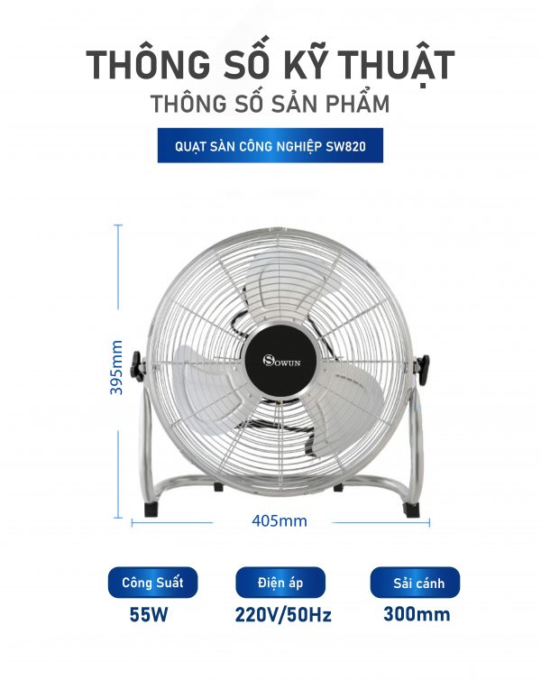 - Quạt sàn công nghiệp Sowun SW 820 được thiết kế với đế nâng bằng chất liệu kim loại sơn chống gỉ cao cấp. Chân đế chắc chắn giúp quạt đứng vững trên nhiều bề mặt khác nhau, hạn chế tình trạng nghiêng, đổ làm ảnh hưởng đến hoạt động quay của quạt cũng như an toàn cho người sử dụng.