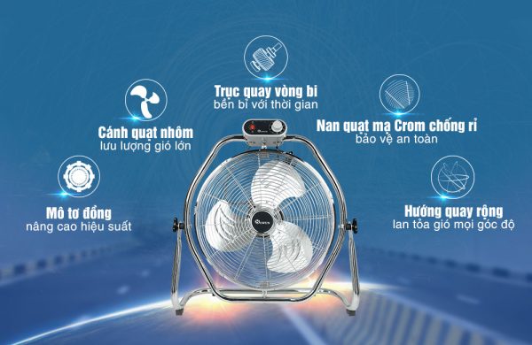 - Lồng quạt được thiết kế an toàn, đặc biệt với gia đình có trẻ nhỏ (hạn chế tình trạng trẻ em nghịch ngợm cho tay vào cánh quạt). Bên cạnh đó,lồng quạt được làm bằng chất liệu kim loại mạ Crom cứng cáp, chống gỉ, bảo vệ quạt trước các tác động mạnh như va đập hay nứt vỡ.